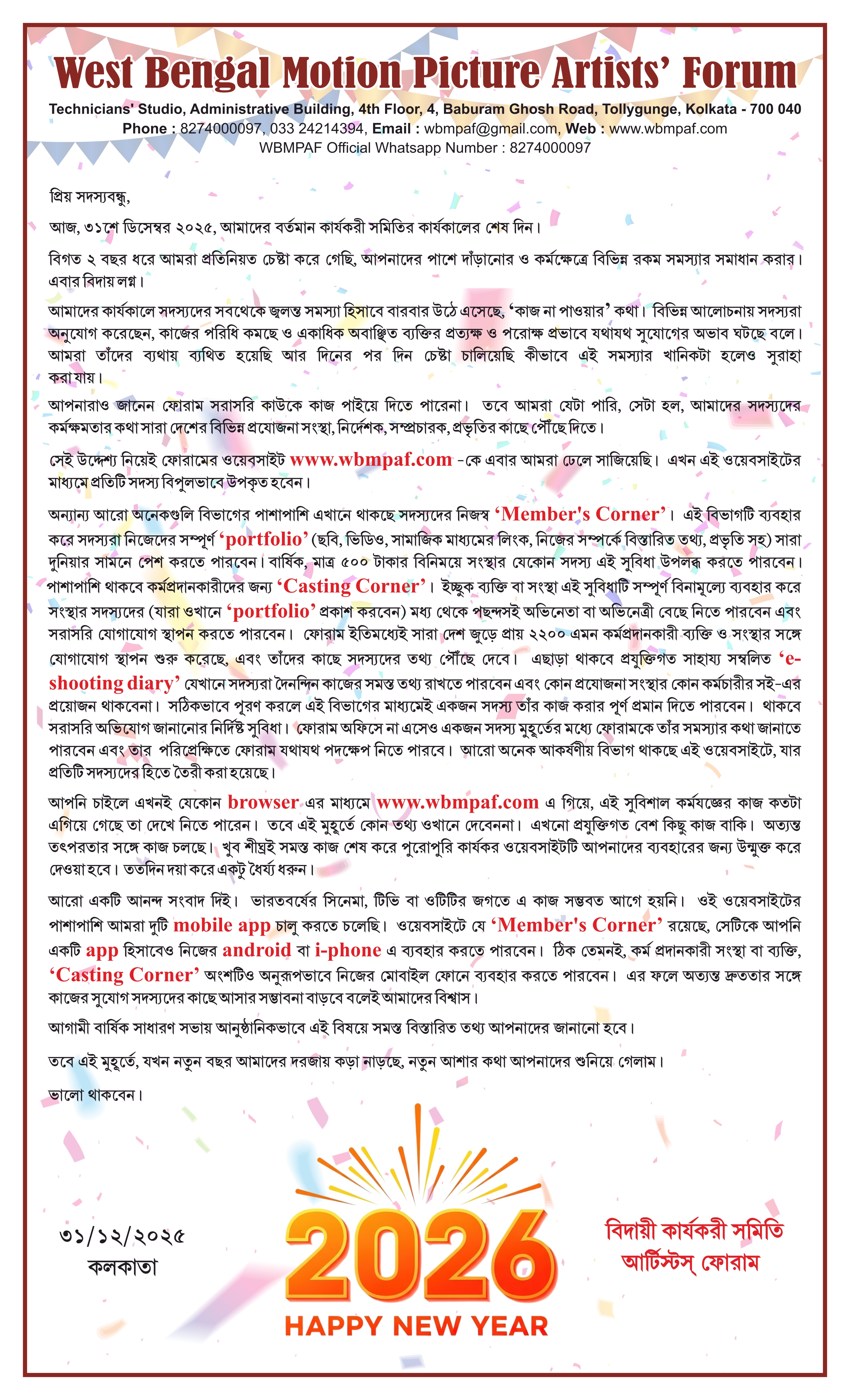 WBMPAF, an autonomous body, is the largest Trade Union organisation of all talky artists in the state of West Bengal and with an active member strength of nearly 4000, the organisation stands as the voice of all aritsts in the film, TV & on industry.