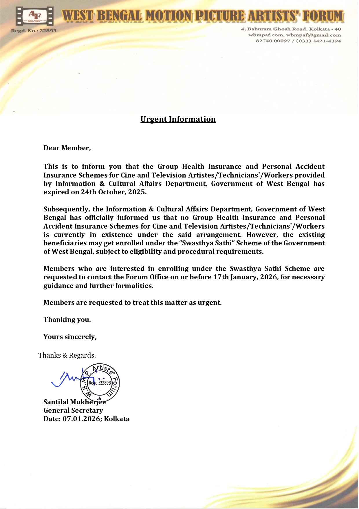 The association was named WEST BENGAL MOTION PICTURES ARTISTS' FORUM and was formed on 12th August, 1998 and later registered under the Indian Trade Union Act 1926 (Regd No 22893)