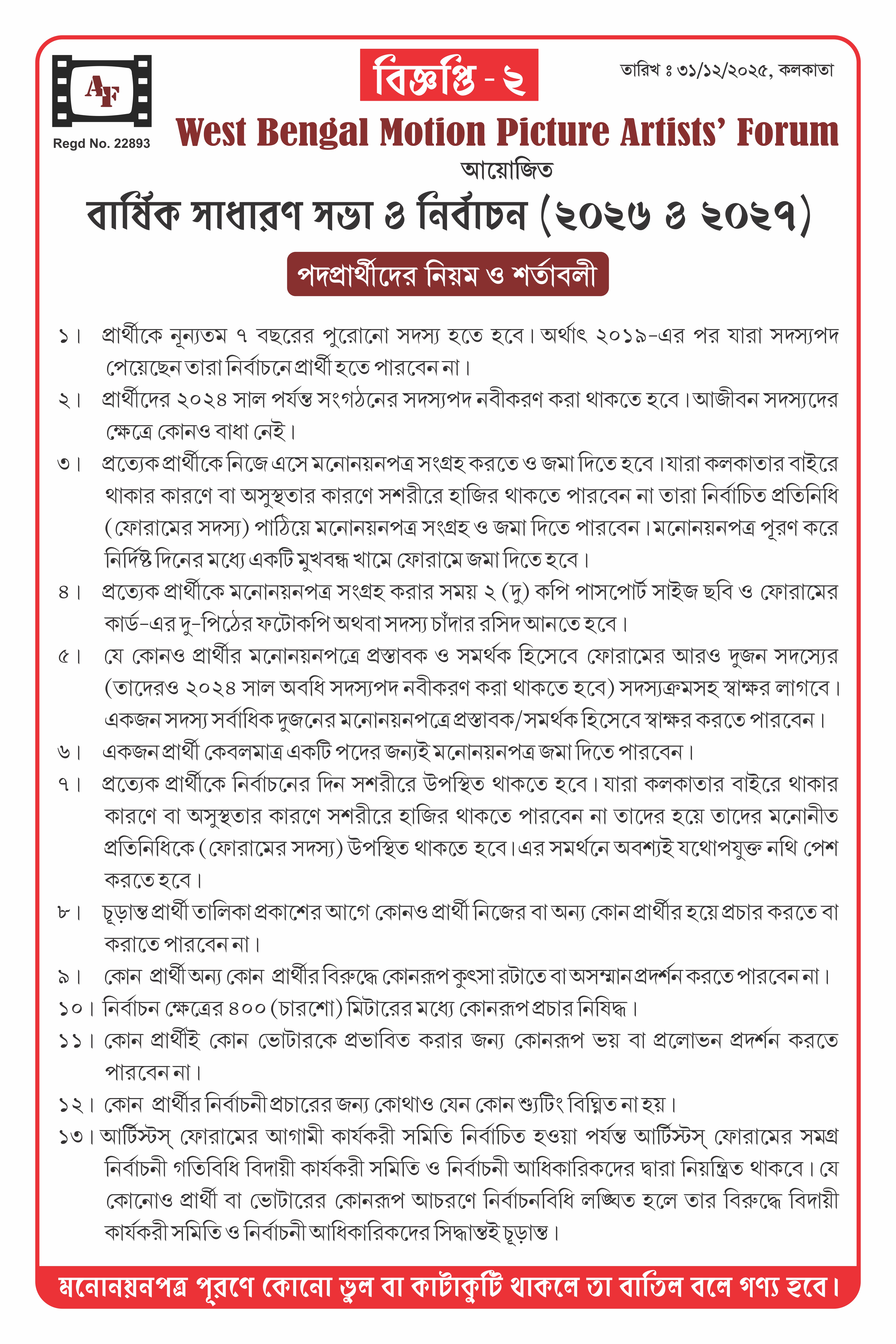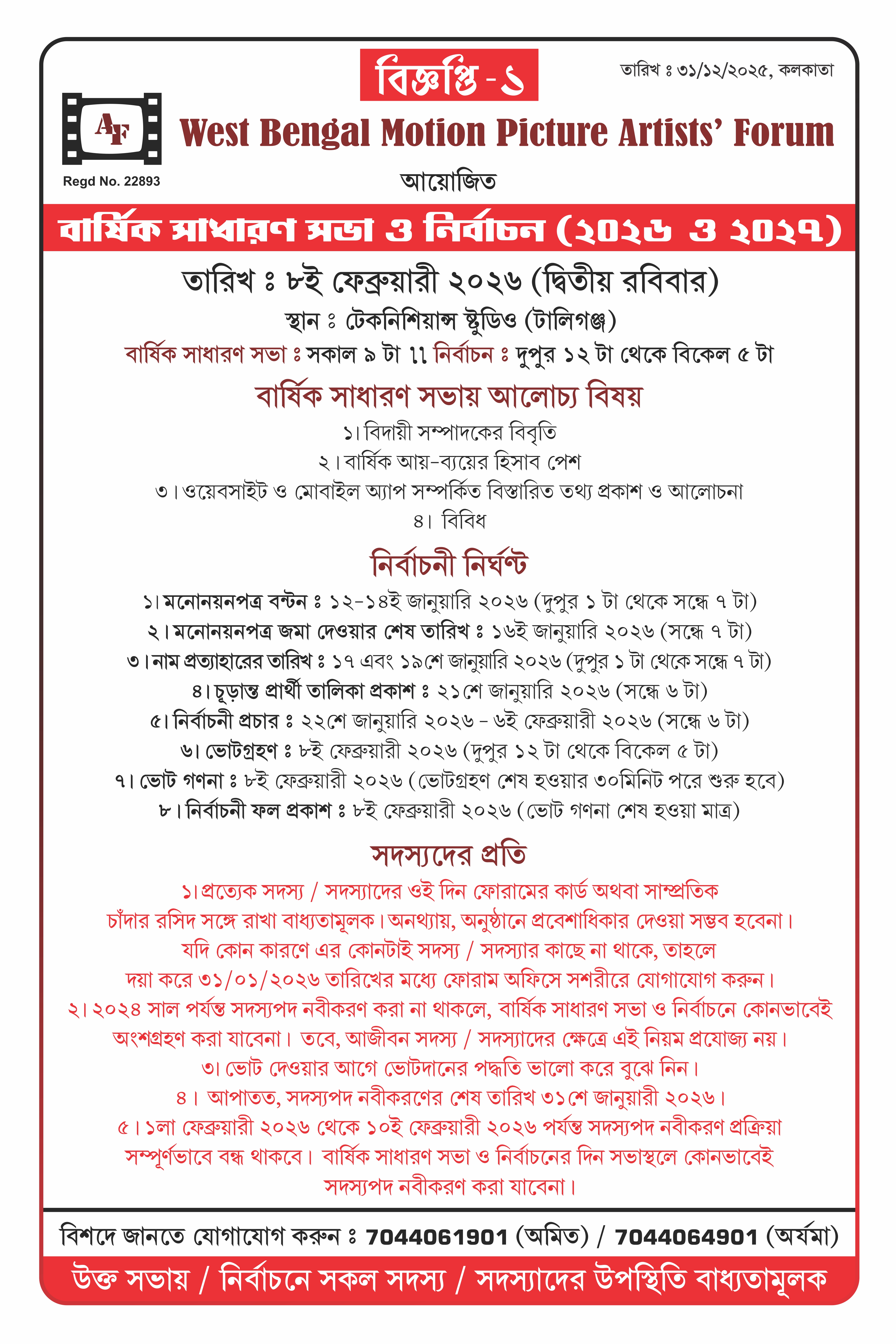 The association was named WEST BENGAL MOTION PICTURES ARTISTS' FORUM and was formed on 12th August, 1998 and later registered under the Indian Trade Union Act 1926 (Regd No 22893)